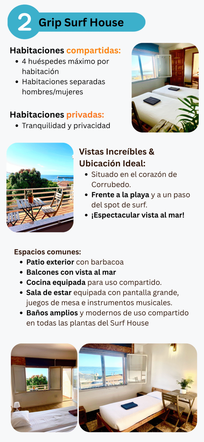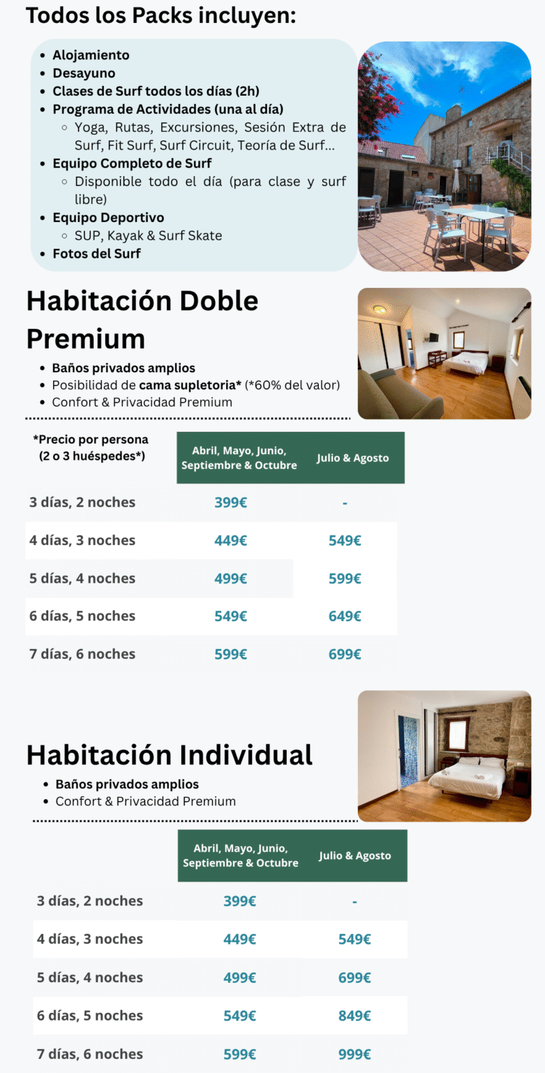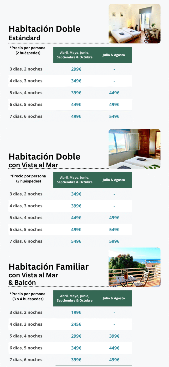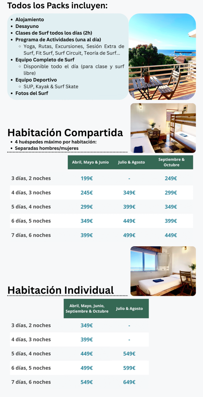 Precios por persona y semana, incluyendo: 7 días / 6 noches de alojamiento, desayuno, clases de surf (7 días), actividades al aire libre (yoga, senderismo, excursiones, volley; varía según la temporada) 1 clase teórica de surf y lectura del pronóstico, fotos y videos, equipo completo de surf (también disponible para surf libre), equipo para: surf skate, volley, SUP y kayak